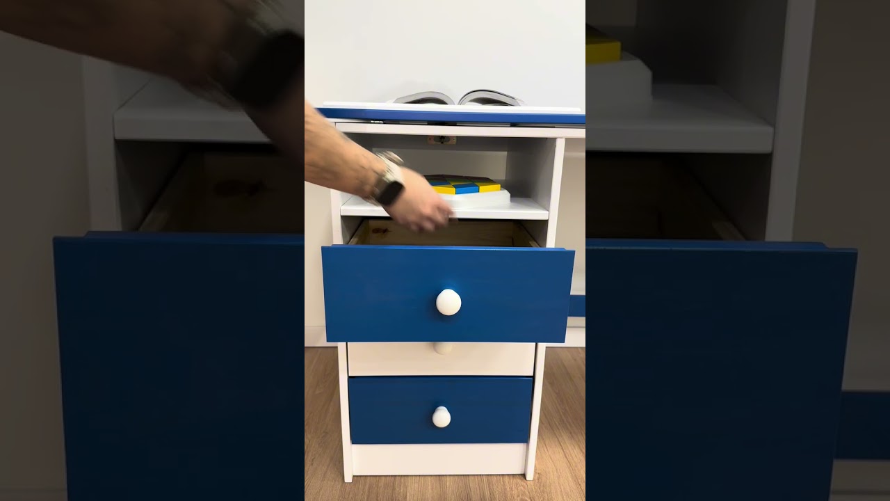 - Le bureau est fabriqué en pin massif, recouvert d'une lasure blanche et d'une lasure bleu.