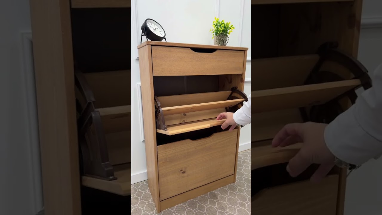- Le meuble à chaussures est fabriqué en pin massif lasuré brun.